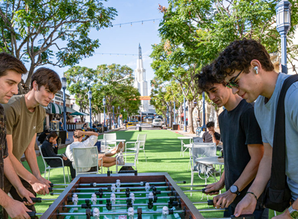 This new, car-free community space on Broxton Avenue between Kinross and Weyburn provides a lively area for walking, dining, and outdoor events. Daily activities feature large games, al fresco dining, and pop-up events.
